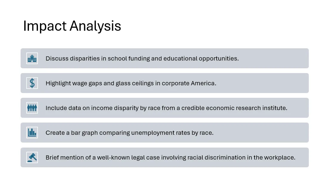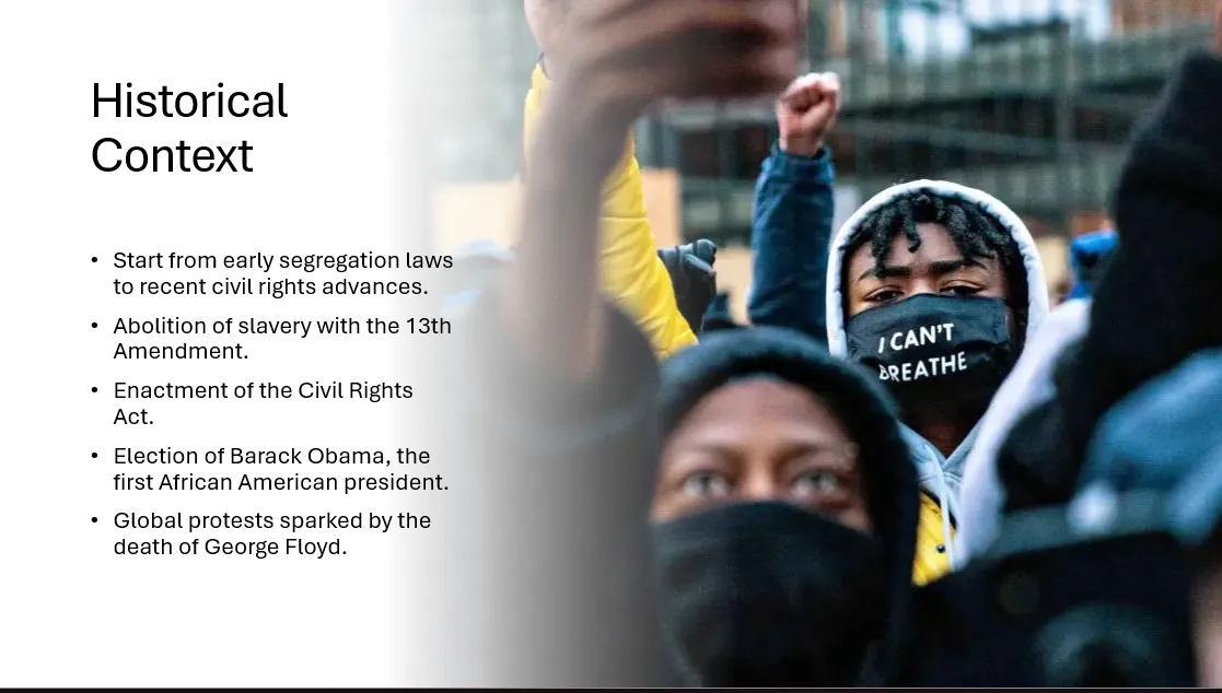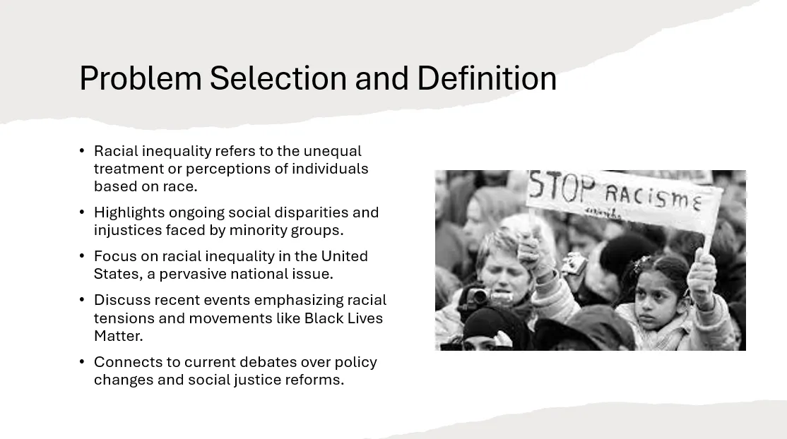 - Visuals: Include a relevant image representing racial inequality, like a historical photo or an infographic.